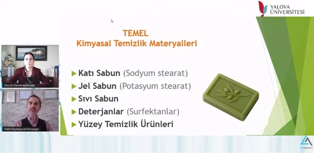 Yalova Üniversitesi öğrenci ve personelinin yanı sıra Türkiye genelinden çok sayıda aktif katılımcının hazır bulunduğu etkinliğin açılış konuşması Yalova Üniversitesi Öğretim Üyesi ve YÜBİTAM Müdürü Doç. Dr. Demet Aydınoğlu tarafından gerçekleştirildi. Konuşmasında COVID-19 salgını döneminde Yalova Üniversitesi’nde uygulanan dezenfeksiyon, hijyen ve sterilizasyon çalışmaları hakkında bilgi vererek başlayan Doç. Dr. Demet Aydınoğlu, daha sonra sözü Kimyasal ve Fiziksel Dezenfektanlar Kitabının Yazarı, Kimyager ve Sürdürülebilir Yaşam Danışmanı Fatih Küçükuysal’a bıraktı.